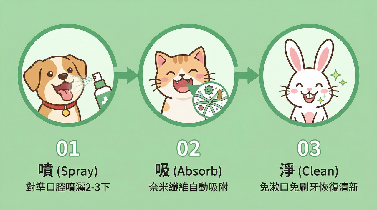 使用方法:直接噴灑於毛孩口腔,有效吸附分解壞菌及異味。